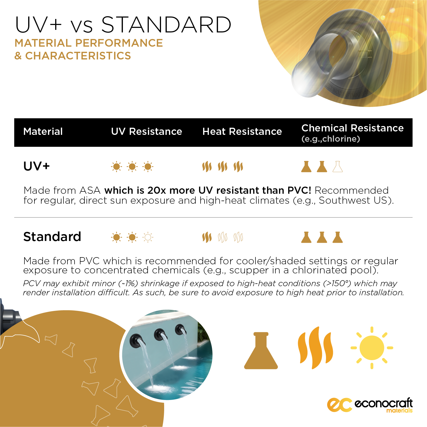 The LokPlate™ plastic downspout nozzle (and included optional-to-install escutcheon plate) is designed to fit standard pipes (from 2-Inch, 3-Inch, 4-Inch, 6-Inch & 8-Inch), enabling optimal water redirection. It can support various use cases, such as a downspout nozzle to prevent staining or erosion of your building's exterior and foundation, or other applicable uses like a pool scupper. This product comes as a two piece set: